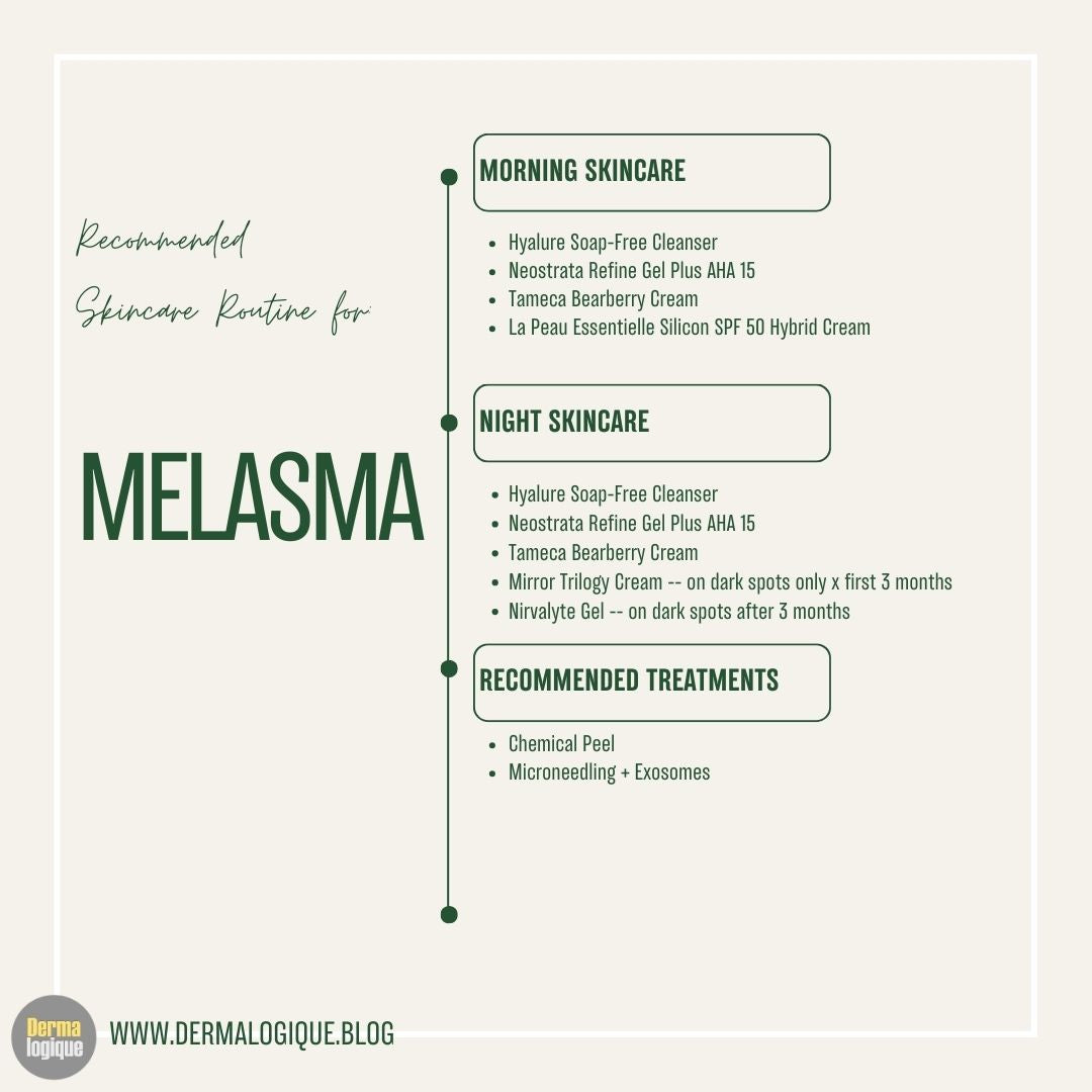 This regimen is tailored to treat melasma of mild to moderate degree. The products are to be applied all over the face unless otherwise specified. You may review each product to learn more about it's indications and proper usage.